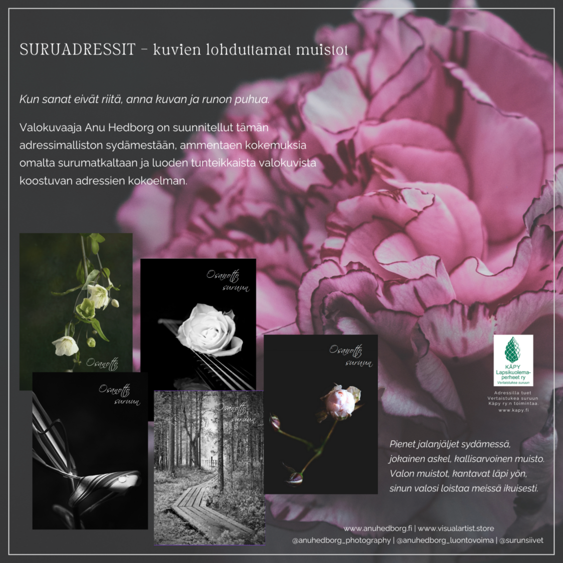 Voit tilata erilaisia suruadresseja yhteistyökumppanimme Anu Hedborg photographyn verkkokaupasta.